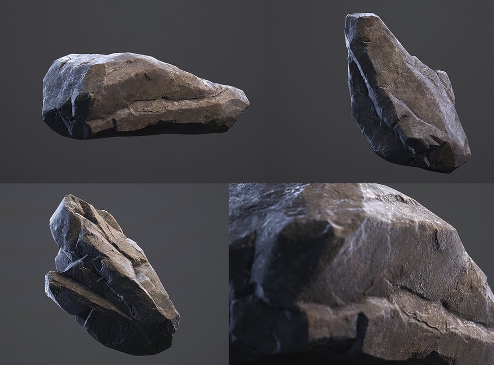 Inside archive you'll find 3 low poly rock model with 4K textures set for each. ( ..._RMA is separated texture which includes R-Roughness, G-Metallic, and B-AmbientOcclusion). Sculpt and texel density is completely 360, turn rocks as you like.